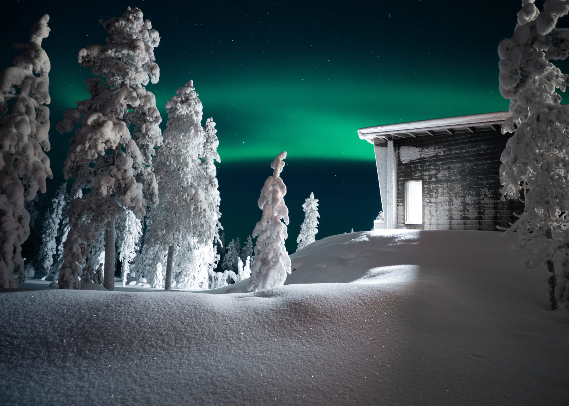 Husky sleigh rides, snowmobile rides and private visits to Father Christmas can also be included. The Northern Lights, also known as the Aurora Borealis, are best observed here in autumn, winter and spring. There are no disturbing city lights and Octola switches off the house lights for even better viewing.