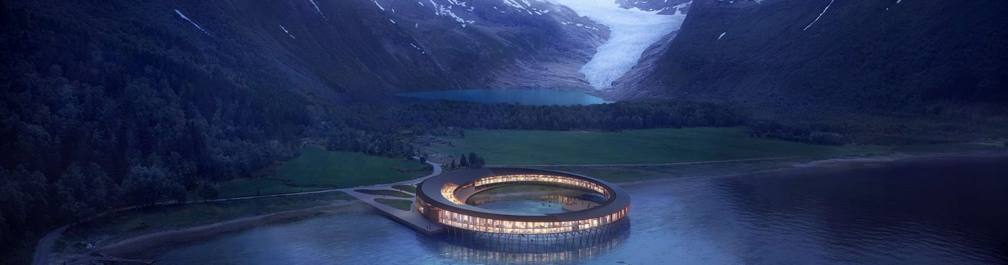Svart is located north of the Arctic Circle in Norway and is characterised by its futuristic circular architecture, which blends harmoniously into the natural surroundings. The structure of the hotel is inspired by traditional Norwegian concepts, particularly the "Fiskehjell" (an A-shaped wooden structure for drying fish) and the "Rorbue" (traditional fishermen's houses). The name Svart means "black" in Norwegian and is a direct reference to the dark blue ice of the Svartisen glacier.