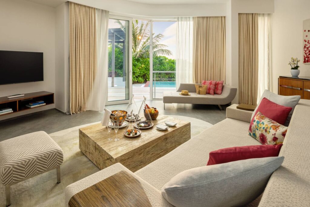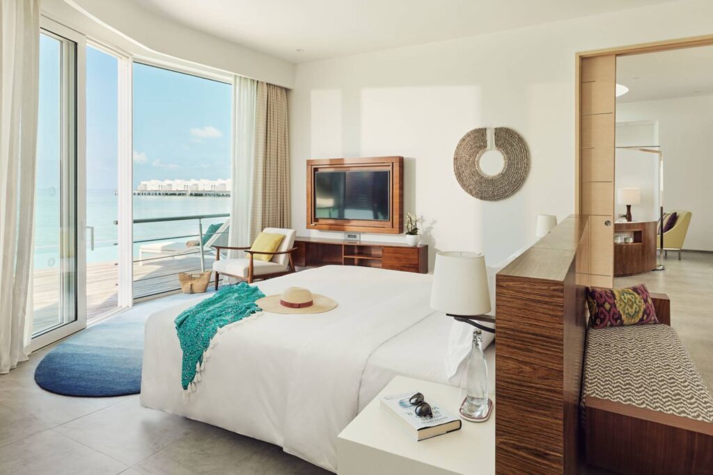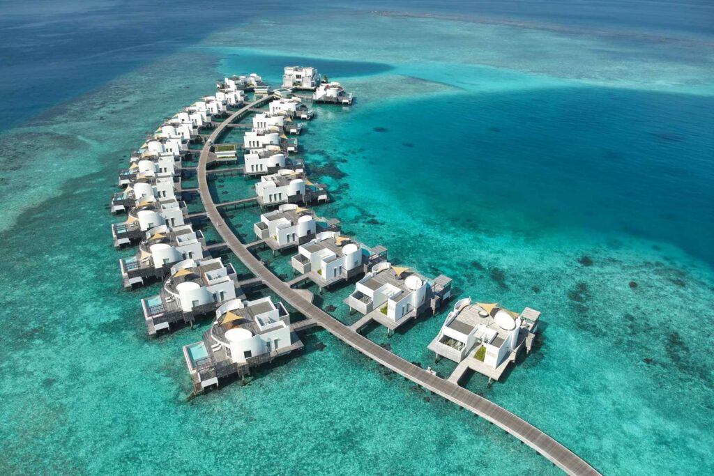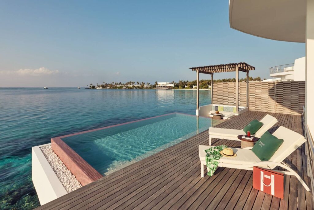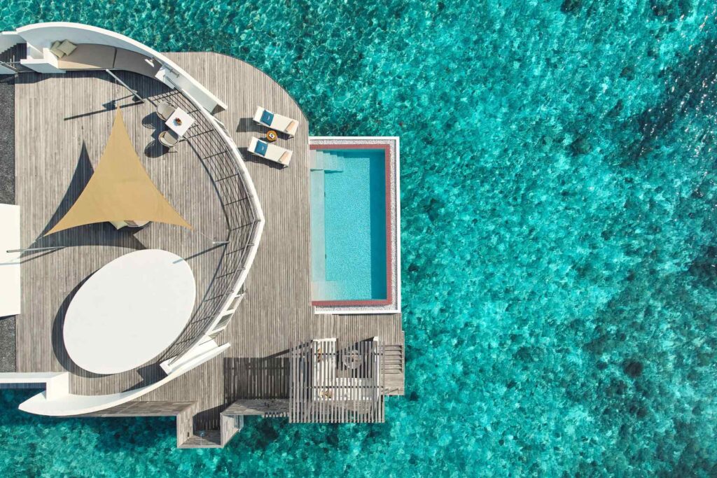 Olhahali Water Retreat with three bedrooms and pool: Inspired by the majestic brain coral, this exclusive three-bedroom water villa offers a unique island holiday in a class of its own. Enjoy the breathtaking sea views, direct access to the ocean and luxurious furnishings with your own private pool.